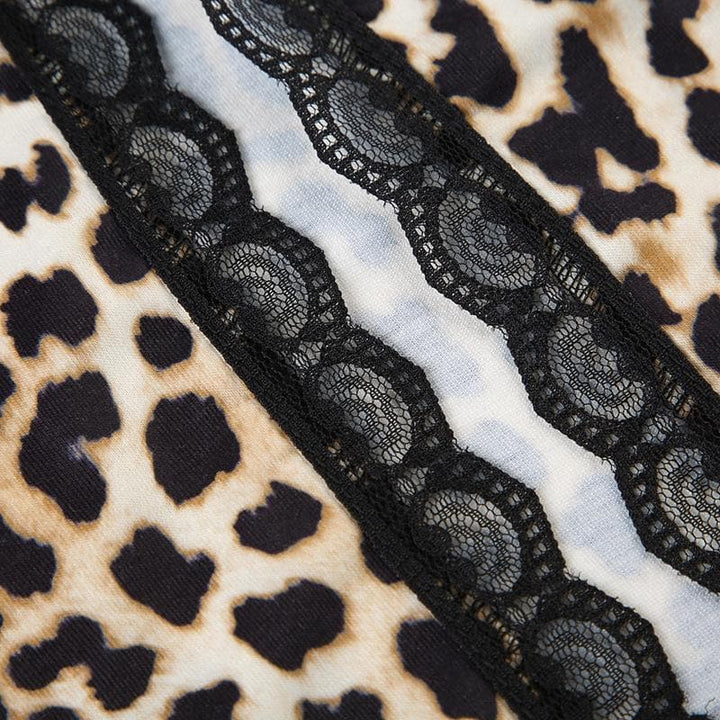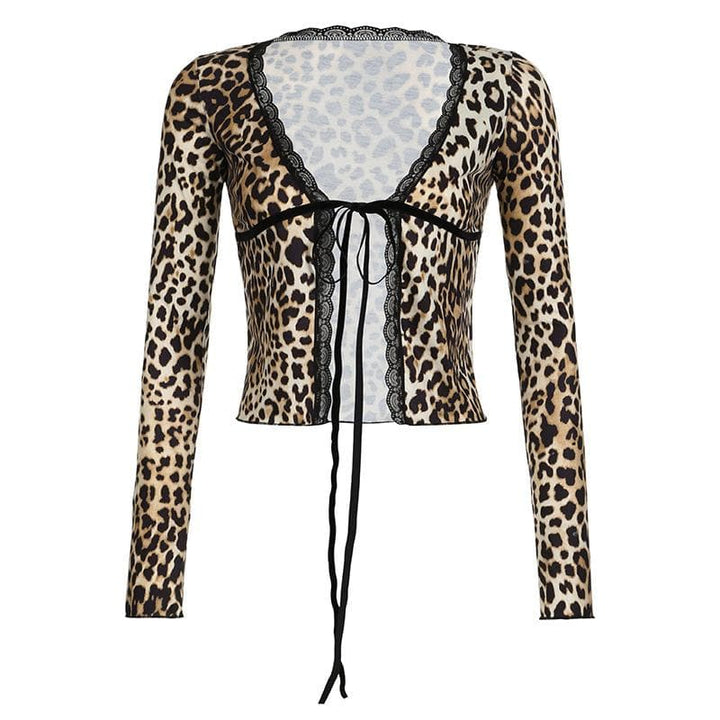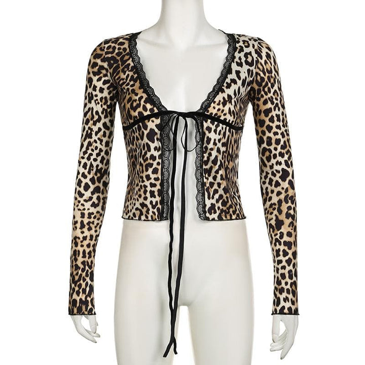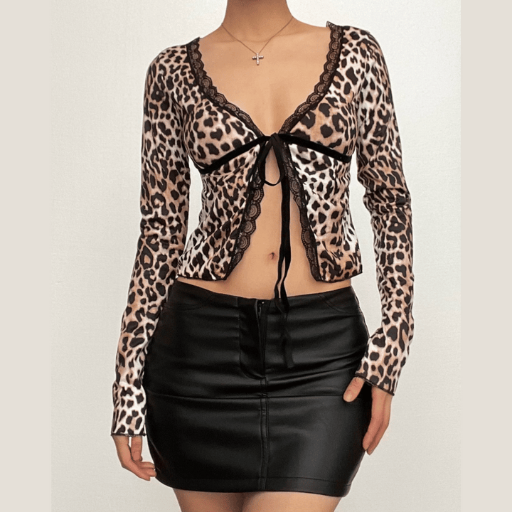 Haut à manches longues avec ourlet en dentelle et imprimé léopard, volants et lien à nouer