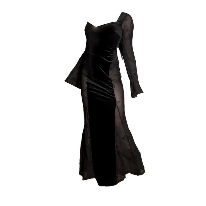 Robe longue en velours à manches longues, col en V, imprimé croisé, en maille patchwork | Robe rave noire