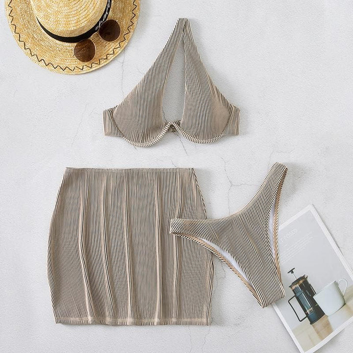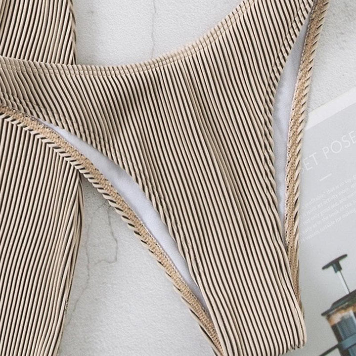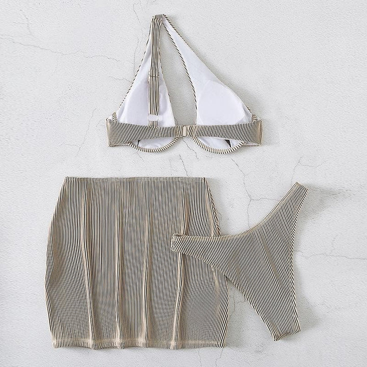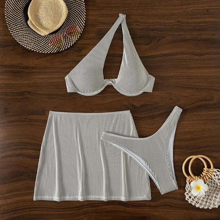 Maillot de bain 3 pièces à une épaule, ajouré, uni, irrégulier, boutonné