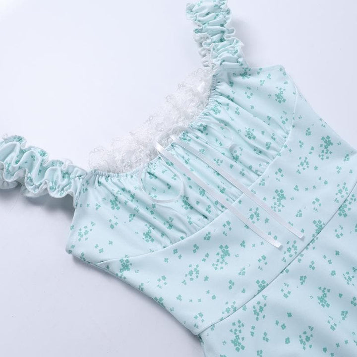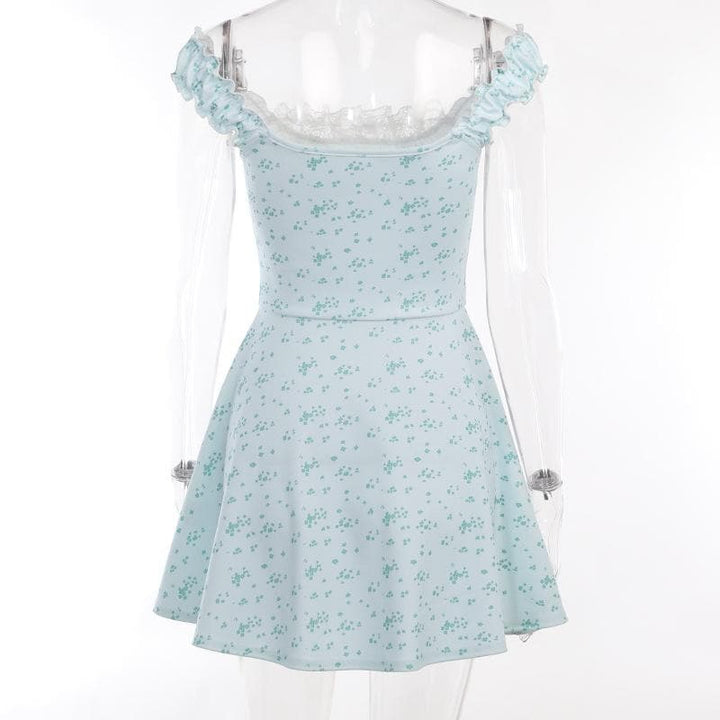 Cap sleeve lace hem ruched flower print contrast mini dress