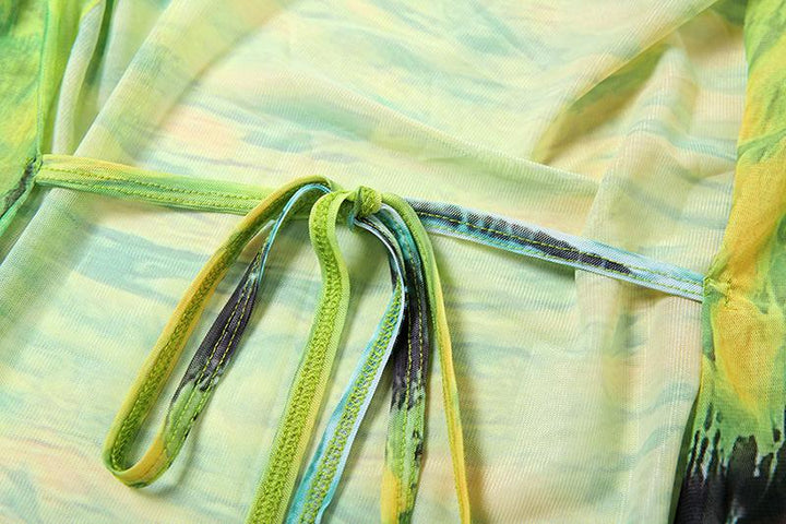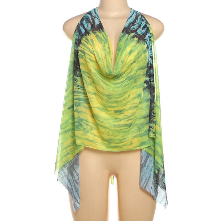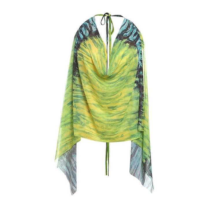 Cowl neck halter self tie print sheer mesh backless top