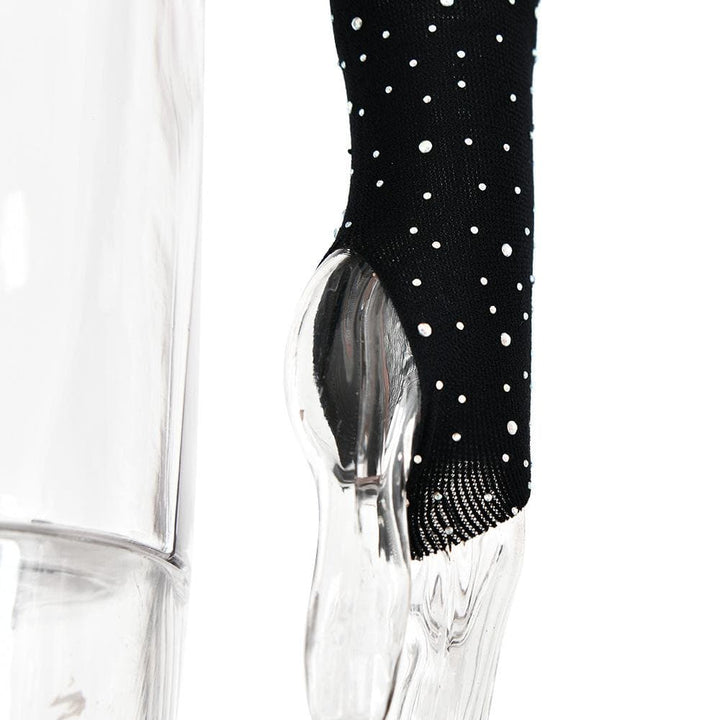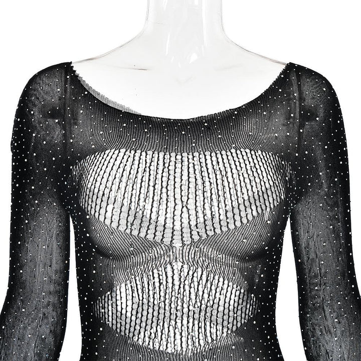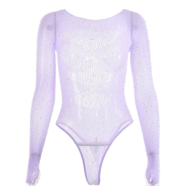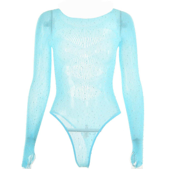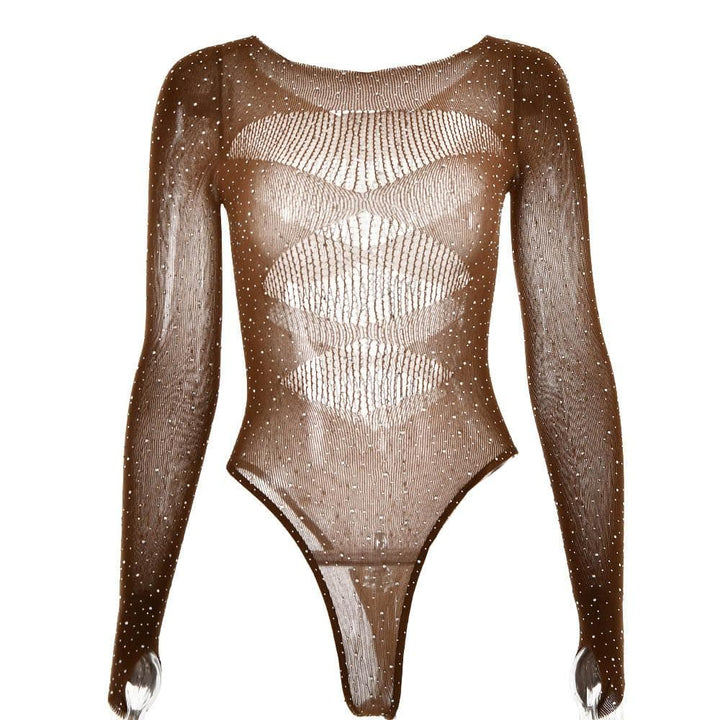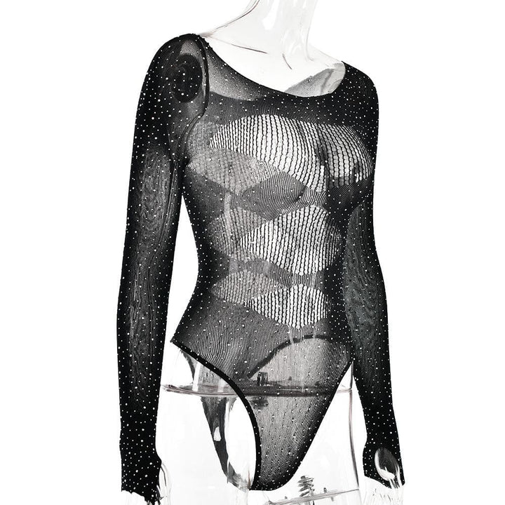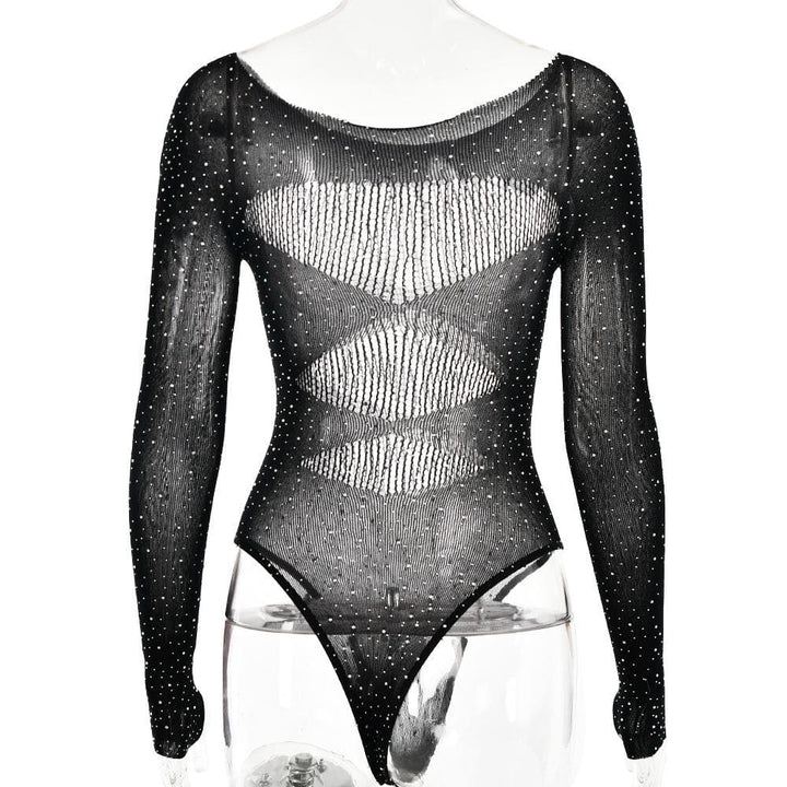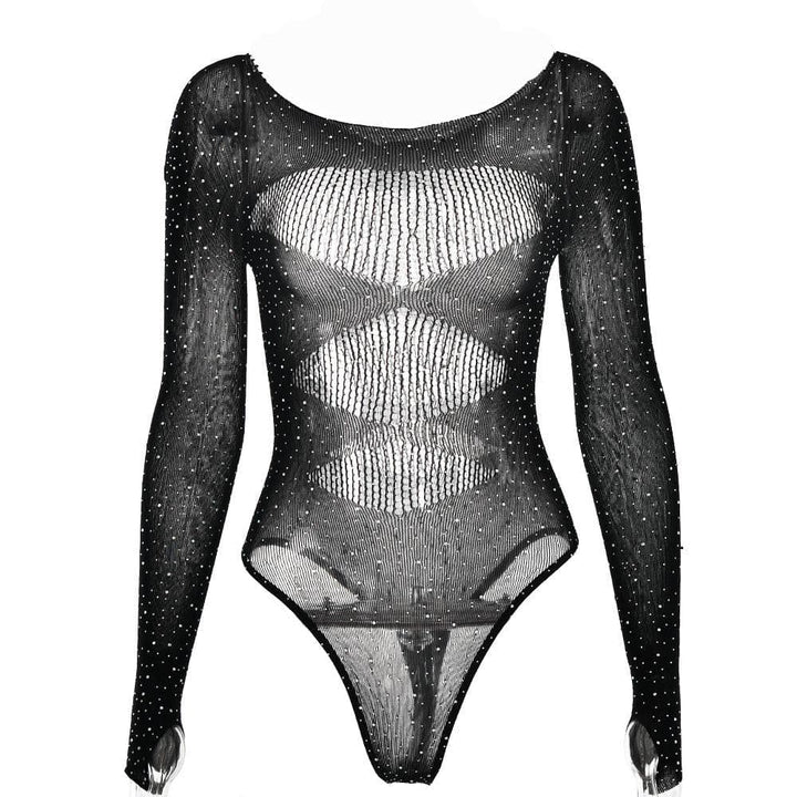Fishnet solid beaded long sleeve gloves round neck bodysuit