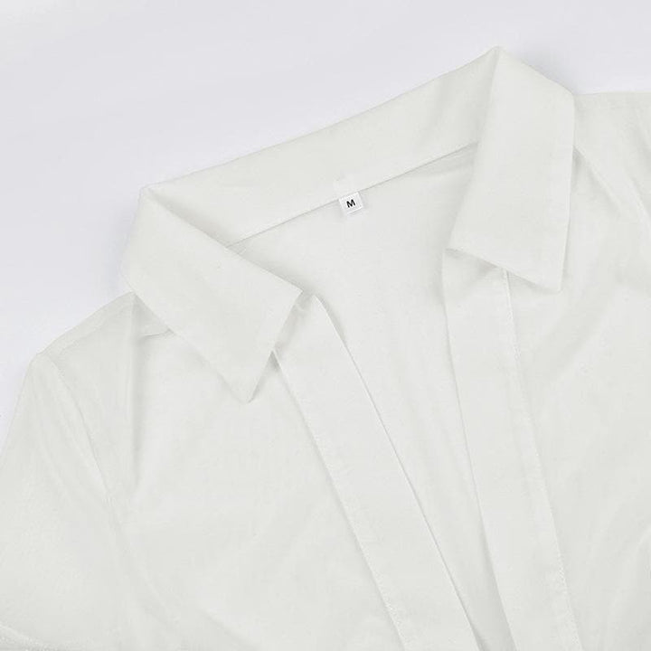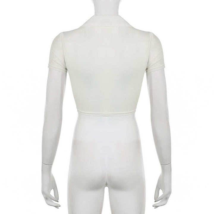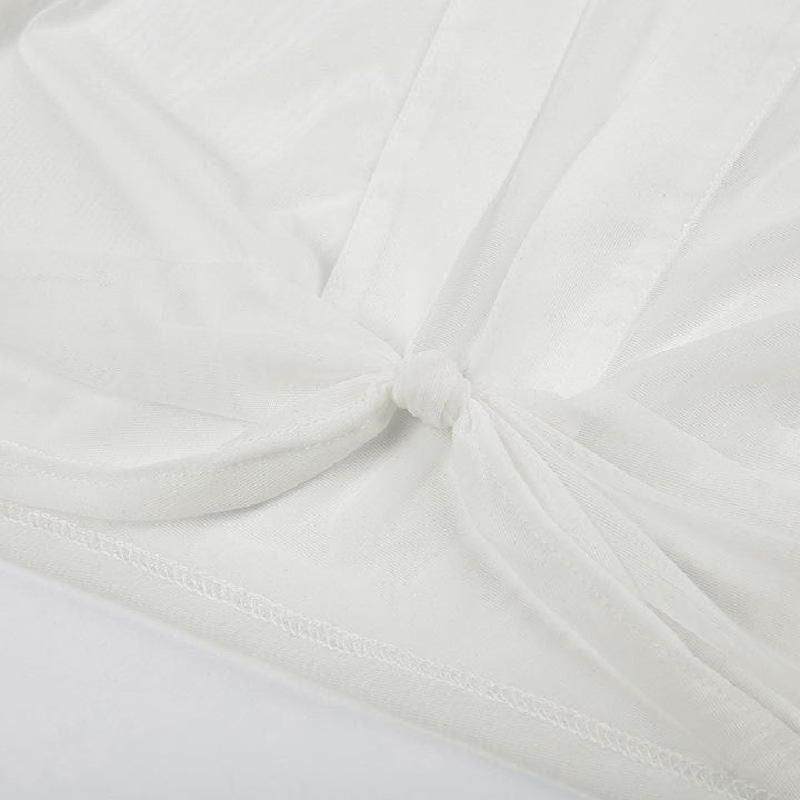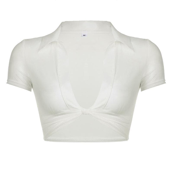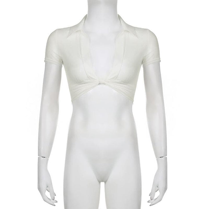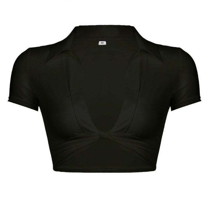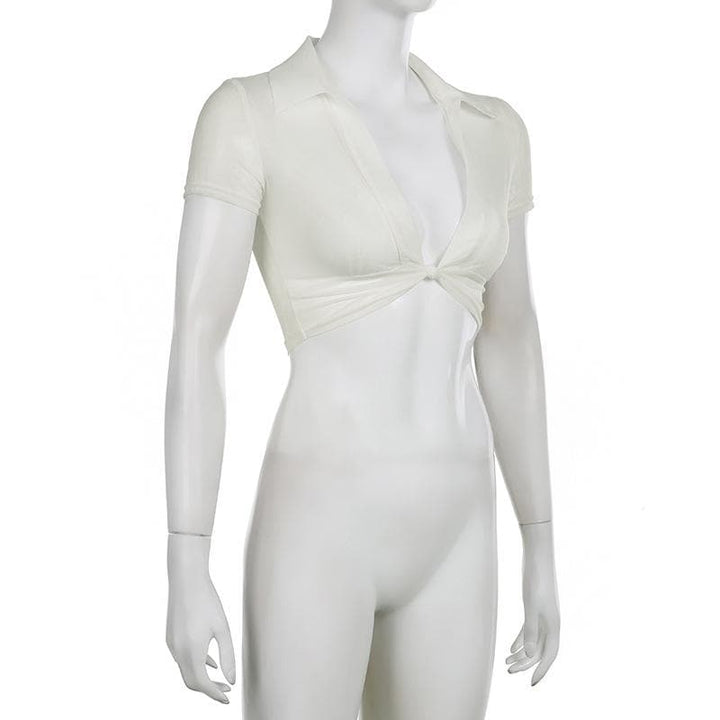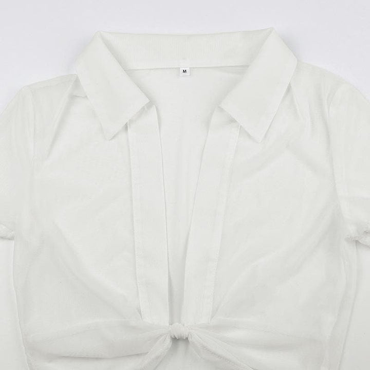 Knotted short sleeve turnover collar sheer mesh see through crop top