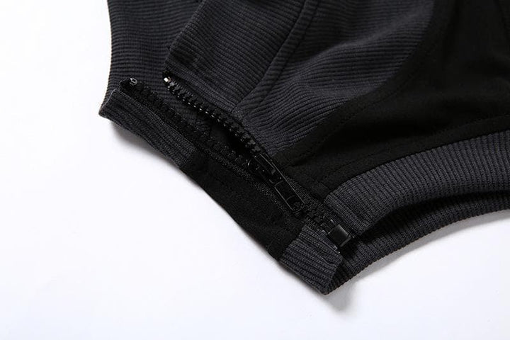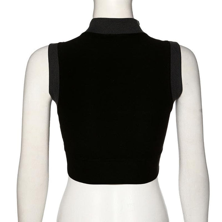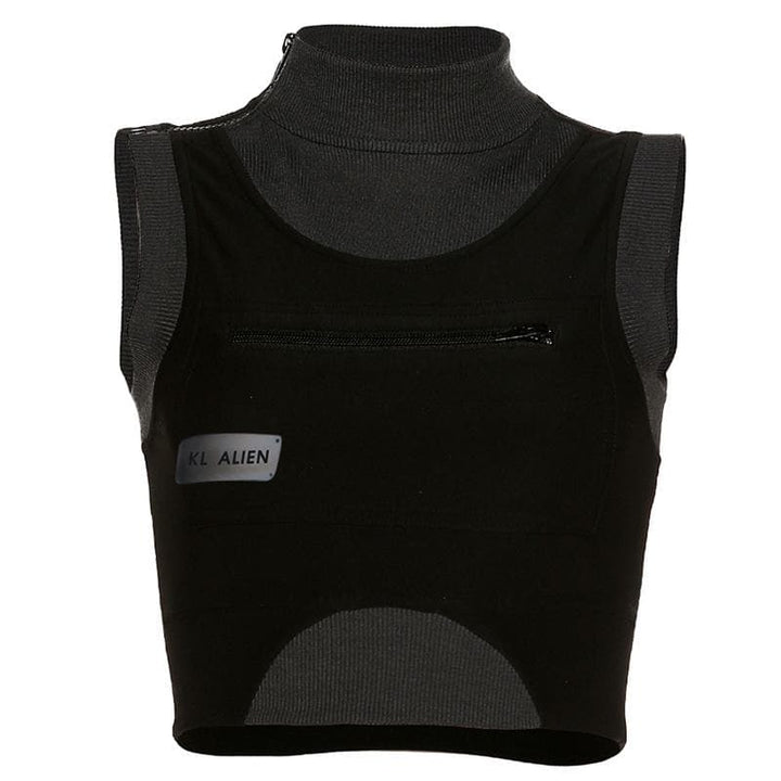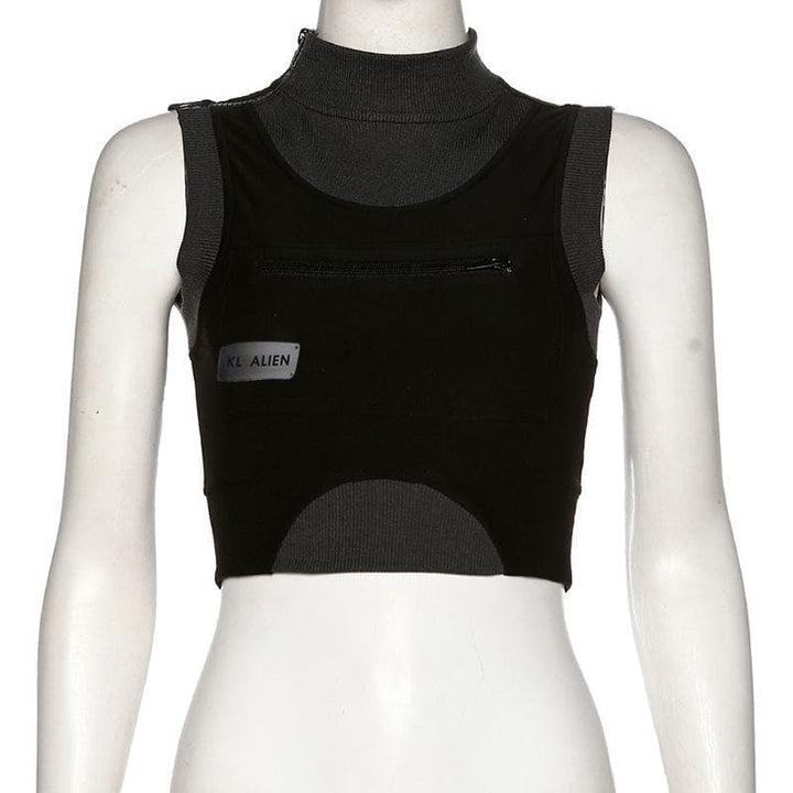 Patchwork ribbed contrast zip-up high neck sleeveless crop top