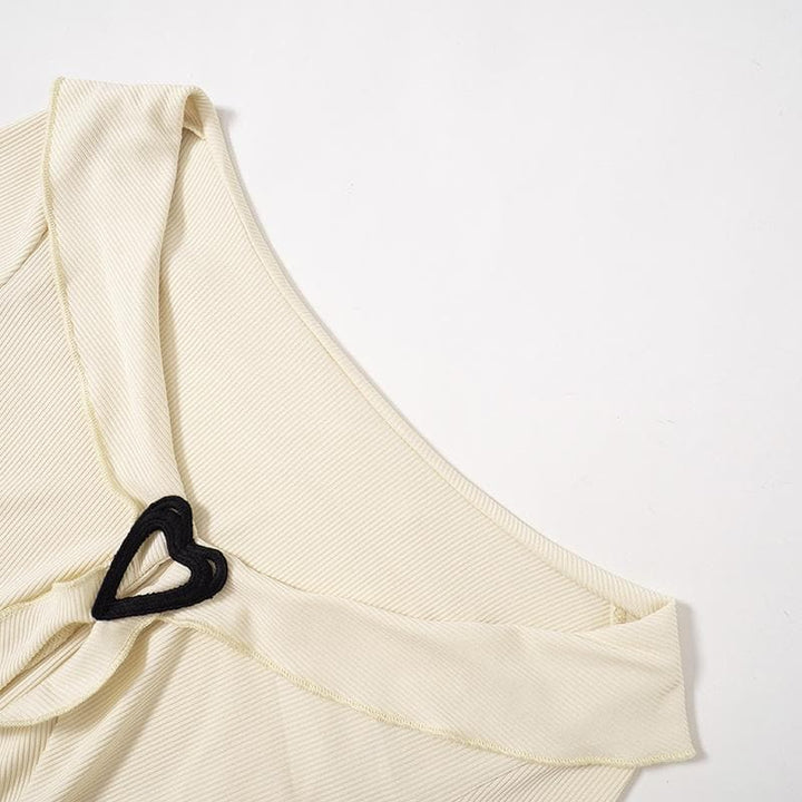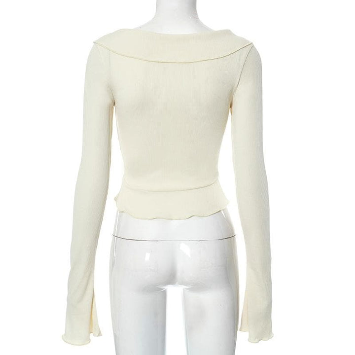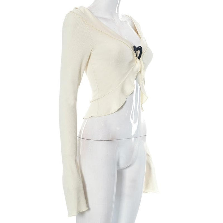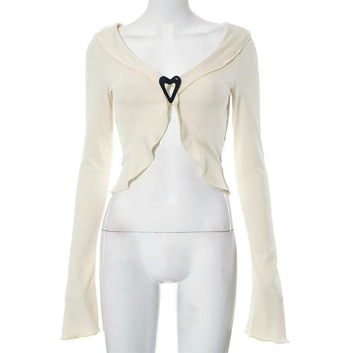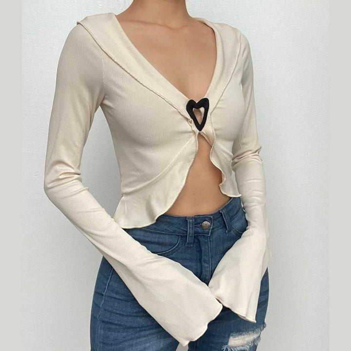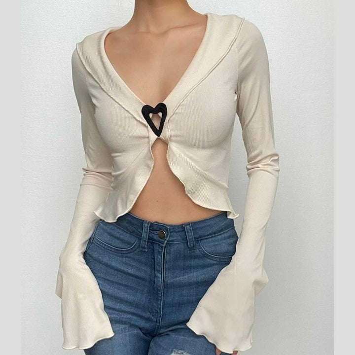 Ribbed flared sleeve heart applique ruffle v neck crop top