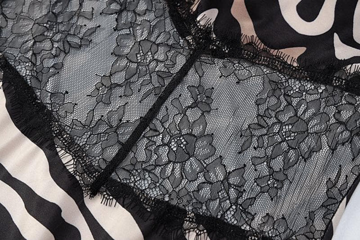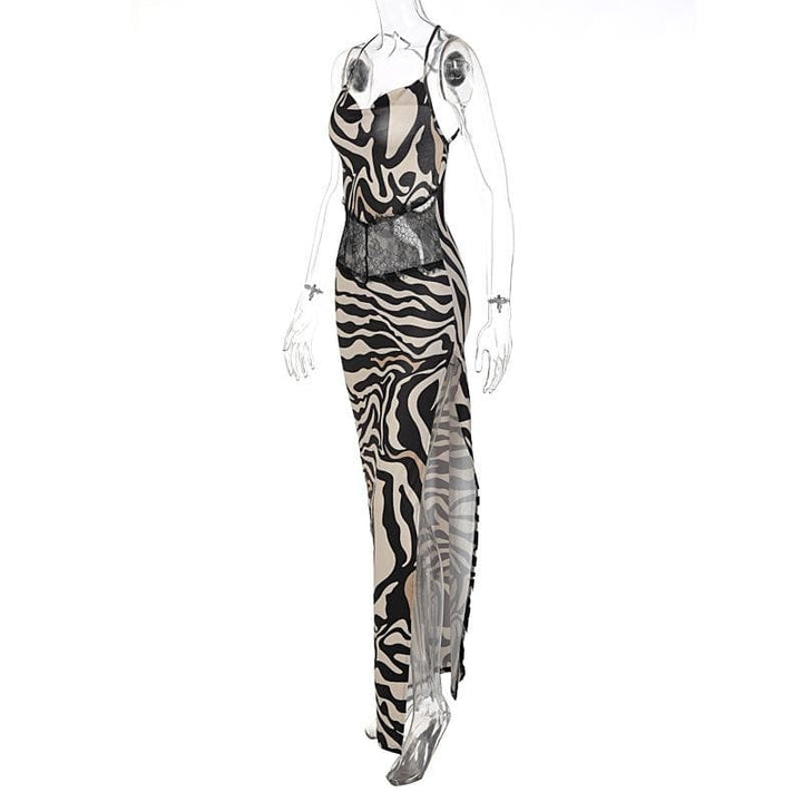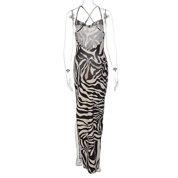 Zebra print hollow out contrast cross back slit backless maxi dress