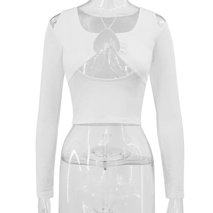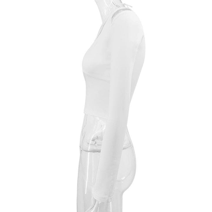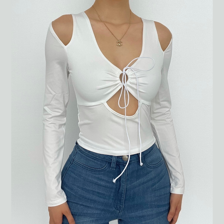 Haut court à manches longues, uni, ajouré, avec cordon de serrage, épaules dénudées et froncée