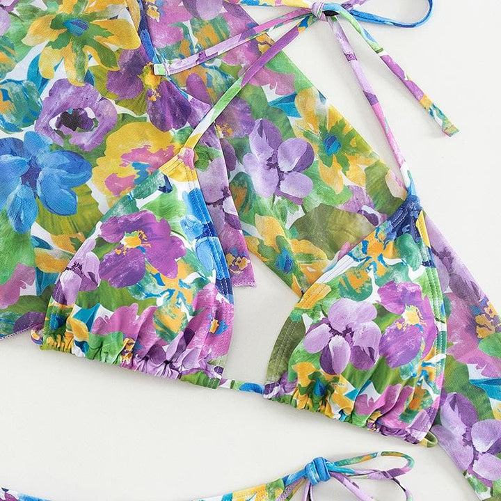 Maillot de bain 3 pièces à manches longues et col licou contrasté avec motif floral en maille