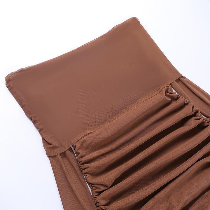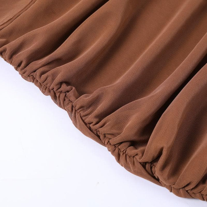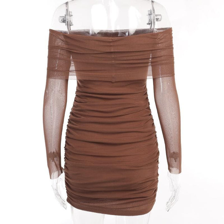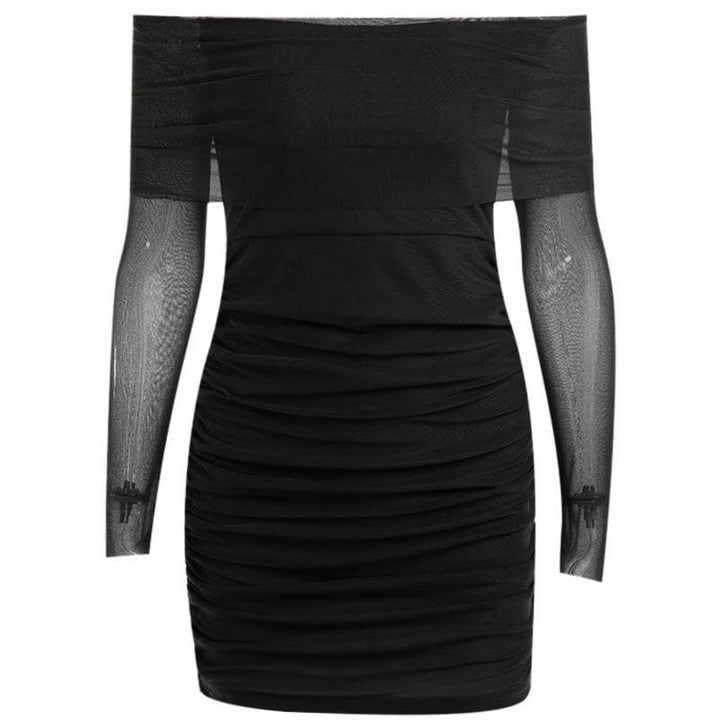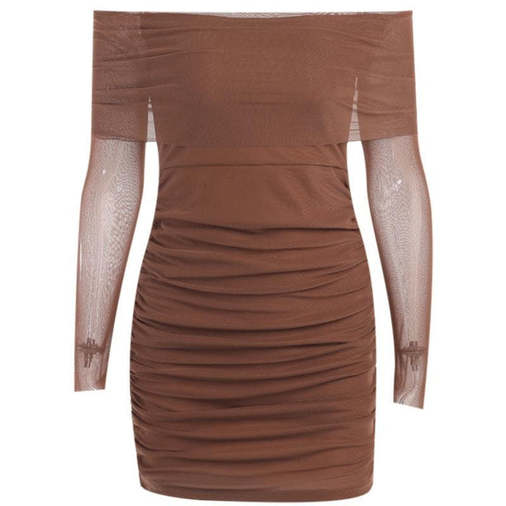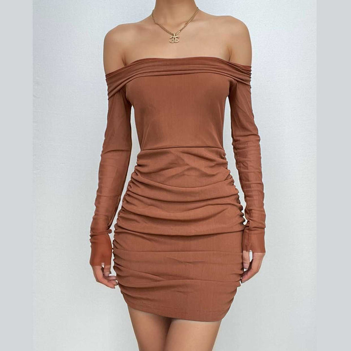 Mini-robe froncée à manches longues et épaules dénudées en maille unie